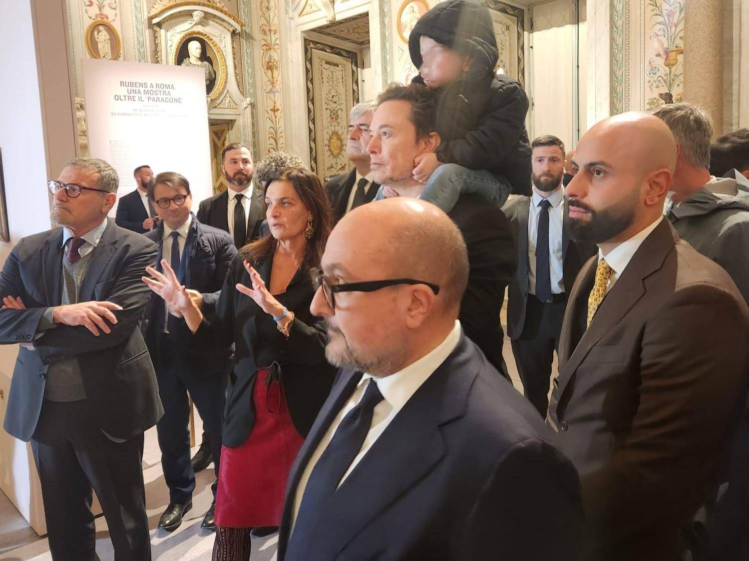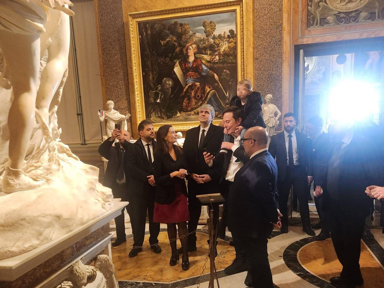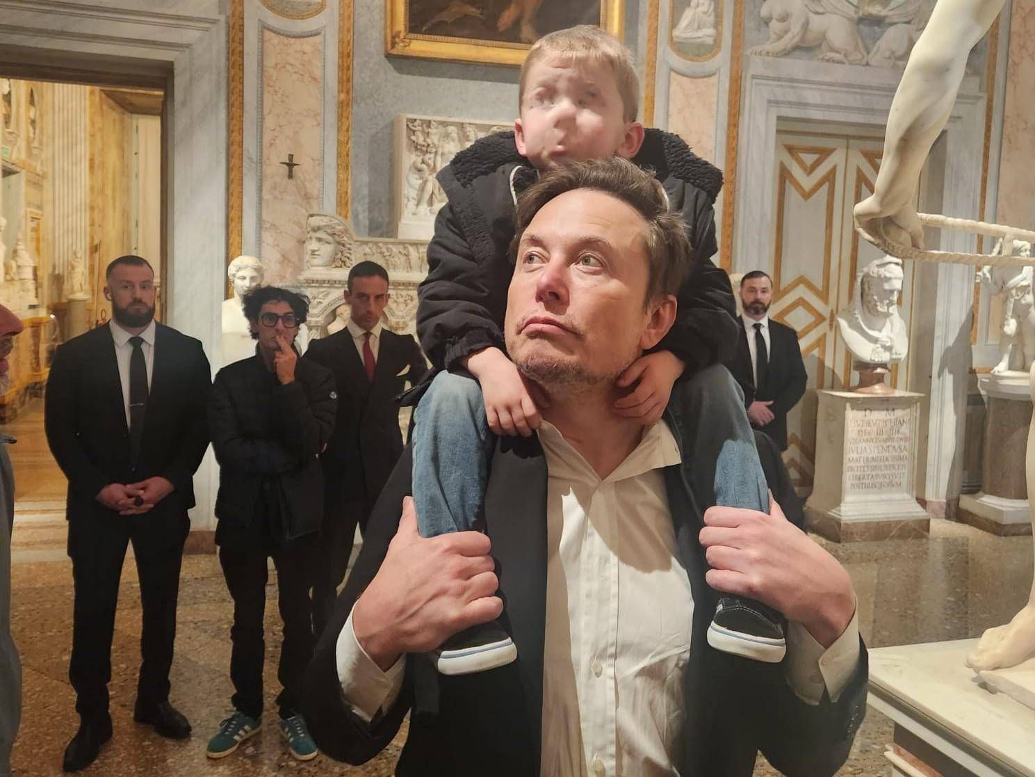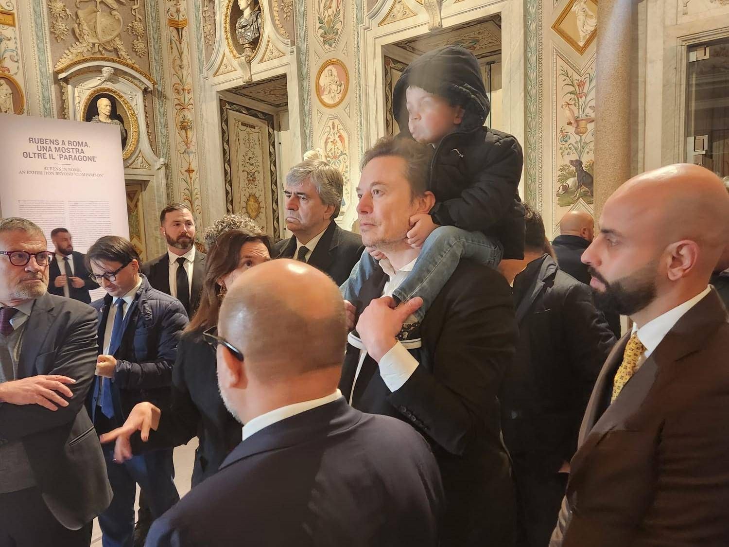 Musk fa il turista: visita alla Galleria Borghese col bimbo sulle spalle