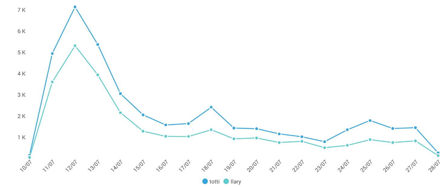 La stampa italiana in queste due settimane ha prodotto 2736 articoli a riguardo mentre il web 6498. Il mood, quindi la percezione dell’evento, risulta essere abbastanza equo anche se poco più a favore di Ilary Blasi (34% mood positivo contro il 33 di Totti).